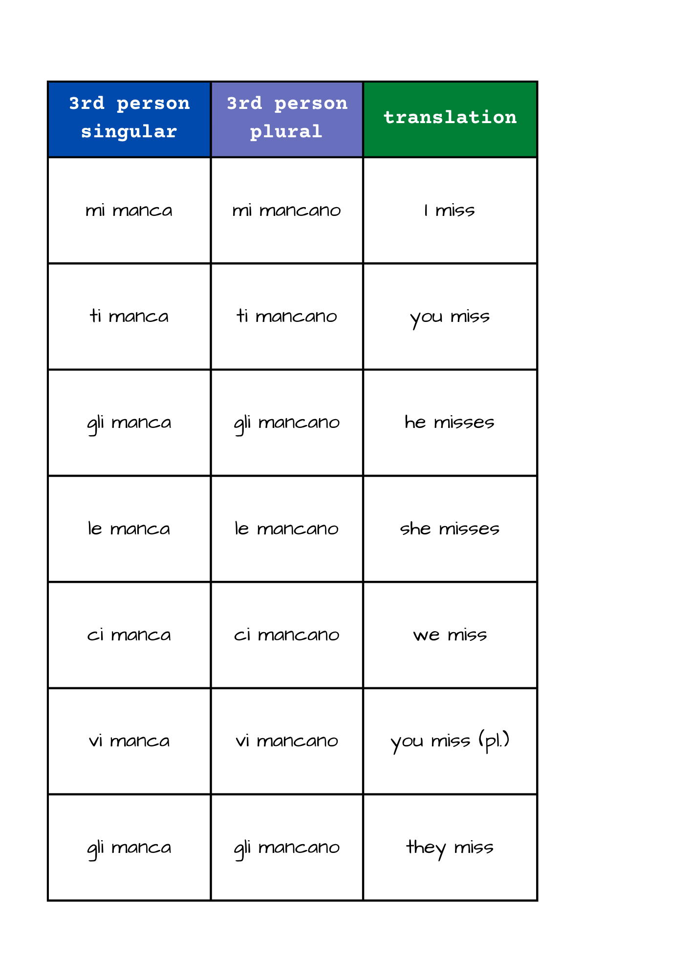 The most common one is the translation of MANCARE with the English verb TO MISS.